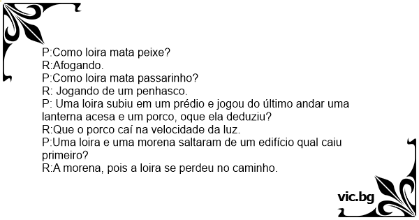 P: Uma loira subiu em um prédio e jogou do último andar uma lanterna acesa e um роrсо, oque ela deduziu?