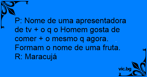 P: Nome de uma apresentadora de tv + o q o Homem gosta de comer + o mesmo q agora. Formam o nome de uma fruta.