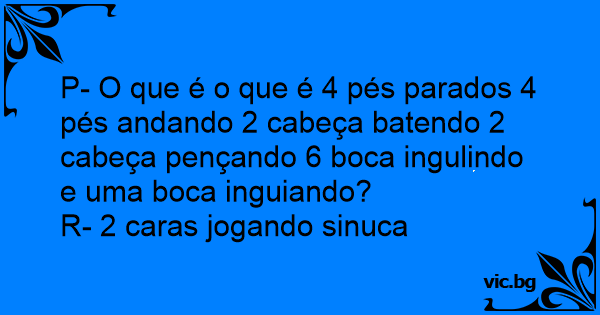 P- O que é o que é 4 pés parados 4 pés andando 2 cabeça batendo 2 cabeça pençando 6 boca ingulindo e uma boca inguiando?