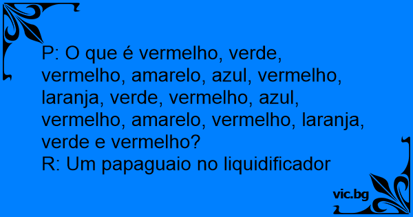 P: O que é vermelho, verde, vermelho, amarelo, azul, vermelho, laranja, verde, vermelho, azul, vermelho, amarelo, vermelho, laranja, verde e vermelho?