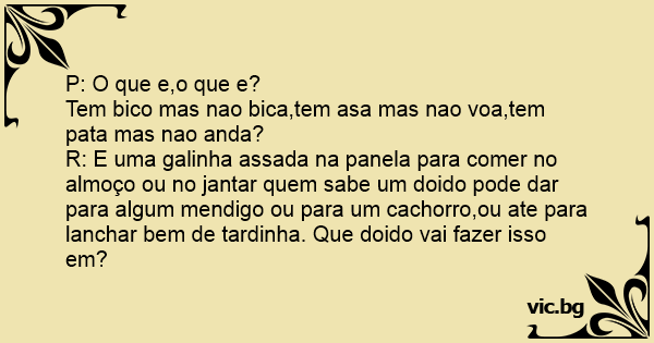 R: E uma gаlinhа assada na panela para comer no almoço ou no jantar quem sabe um doido pode dar para algum mendigo ou para um сасhоrrо,ou ate para lanchar bem de tardinha. Que doido vai fazer isso em?