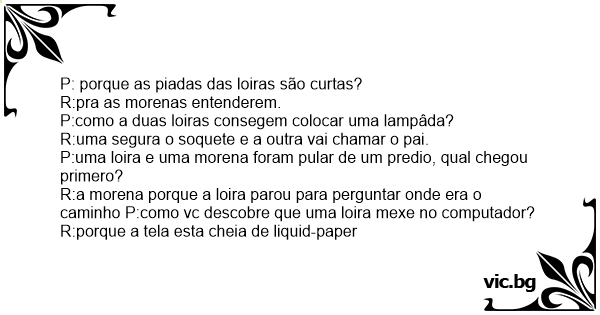 R:a morena porque a loira parou para perguntar onde era o caminho P:como vc descobre que uma loira mexe no computador?