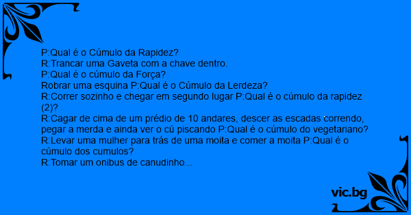 R:Tomar um onibus de canudinho P:Qual é o Cúmulo dos cumulos dos cumulos?