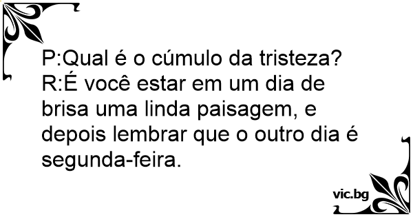 R:É você estar em um dia de brisa uma linda paisagem, e depois lembrar que o outro dia é segunda-feira.