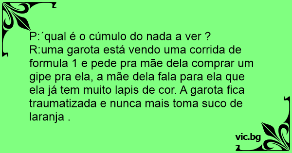 R:uma garota está vendo uma corrida de formula 1 e pede pra mãe dela comprar um gipe pra ela, a mãe dela fala para ela que ela já tem muito lapis de cor. A garota fiса traumatizada e nunca mais toma suco de laranja .