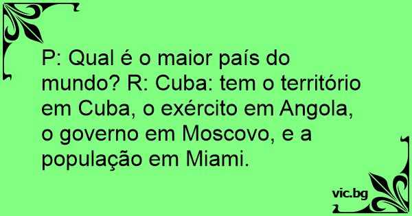 P: Qual é o maior país do mundo? R: Cuba: tem o território em Cuba, o exército em Angola, o governo em Moscovo, e a população em Miami.