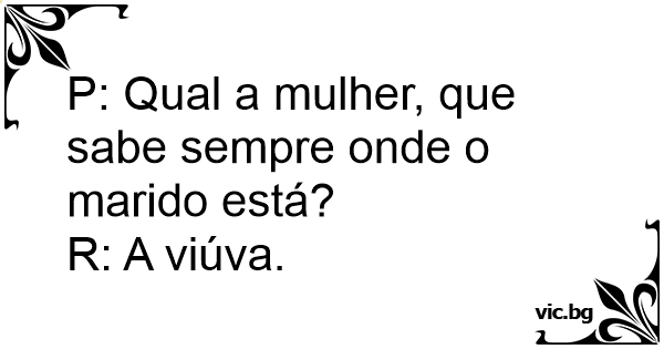 Como se chama a mulher que sabe onde o marido está todas as noites ? R: Viúva.