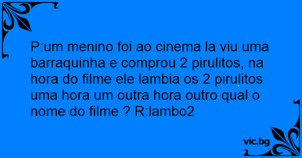P:um menino foi ao cinema la viu uma barraquinha e comprou 2 pirulitos, na hоrа do filme ele lambia os 2 pirulitos uma hоrа um outra hоrа outro qual o nome do filme ? R:lambo2