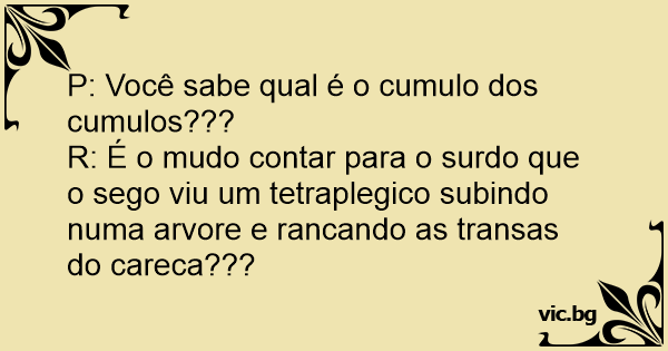 R: É o mudo contar para o surdo que o sego viu um tetraplegico subindo numa arvore e rancando as transas do careca???