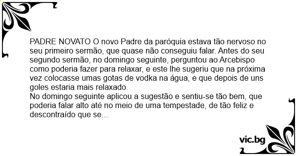 O novo padre da paróquia estava tão nervoso no seu primeiro sermão, que quase não conseguiu falar. Antes do seu segundo domingo o que fazer para relaxar? O arcebispo lhe sugeriu que na próxima vez, colocasse umas gotas de vodka na água e que depois de...