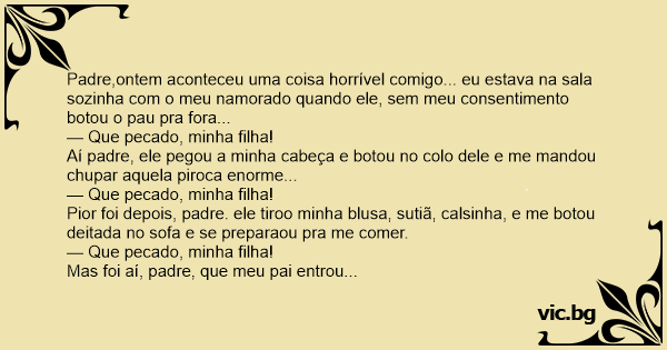 Pior foi depois, padre. ele tiroo minha blusa, sutiã, calsinha, e me botou deitada no sofa e se preparaou pra me comer.