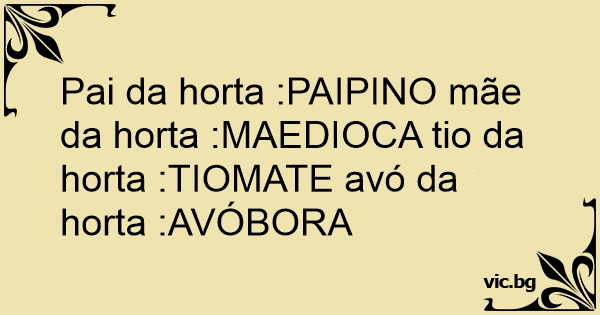 Pai da horta :PAIPINO mãe da horta :MAEDIOCA tio da horta :TIOMATE avó da horta :AVÓBORA