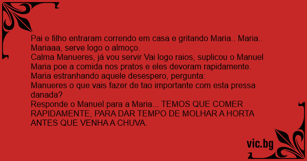 Responde o Manuel para a Maria... TEMOS QUE COMER RAPIDAMENTE, PARA DAR TEMPO DE MOLHAR A HORTA ANTES QUE VENHA A CHUVA.