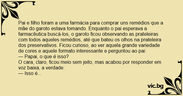 Pai e filho foram a uma farmácia para comprar uns remédios que a mãe do garoto estava tomando. Enquanto o pai esperava a farmacêutica buscá-los, o garoto ficou observando as prateleiras com todos aqueles remédios, até que bateu os olhos na prateleira dos preservativos. Ficou curioso, ao ver aquela grande variedade de cores e aquele formato interessante e perguntou ao pai: