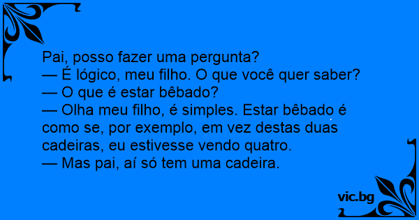 — Olha meu filho, é simples. Estar bêbado é como se, por exemplo, em vez destas duas cadeiras, eu estivesse vendo quatro.