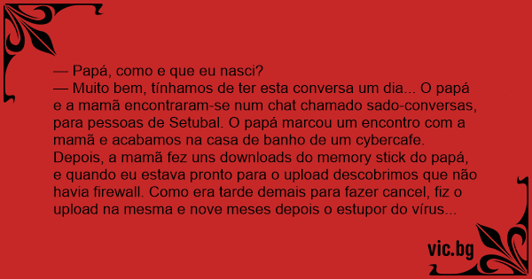 — Muito bem, tínhamos de ter esta conversa um dia... O papá e a mamã encontraram-se num chat chamado sado-conversas, para pessoas de Setubal. O papá marcou um encontro com a mamã e acabamos na casa de banho de um cybercafe. Depois, a mamã fez uns downloads do memory stick do papá, e quando eu estava pronto para o upload descobrimos que não havia firewall. Como era tarde demais para fazer cancel, fiz o upload na mesma e nove meses depois o estupor do vírus apareceu.
