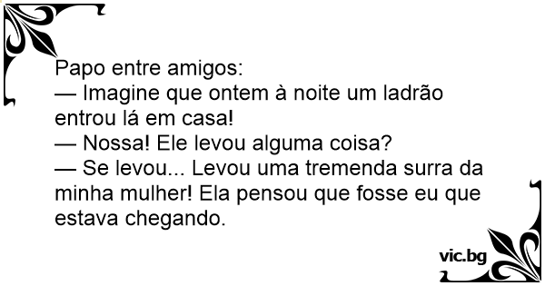 — Se levou... Levou uma tremenda surra da minha mulher! Ela pensou que fosse eu que estava chegando.