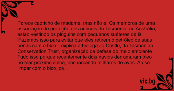 Parece capricho de madame, mas não é. Os membros de uma associação de proteção dos animais da Tasmânia, na Austrália, estão vestindo os pingüins com pequenos suéteres de lã. 'Fazemos isso para evitar que eles retirem o petróleo de suas penas com o bico ', explica a bióloga Jo Castle, da Tasmanian Conservation Trust, organização de defesa do meio ambiente. Tudo isso porque recentemente dois navios derramaram óleo no mar próximo à ilha, encharcando milhares de aves. Ao se limpar com o bico, os pingüins acabam se intoxicando e morrem. Como a entidade não tinha condições de confeccionar sozinha as roupas protetoras, fez um apelo na imprensa. A resposta foi avassaladora. 'Já recebemos mais de mil suéteres, boa parte vinda do Japão', diz Castle. Os pingüins, obviamente, detestam as roupinhas e tentam evitar a todo custo vesti-las. 'Mas nós não desistimos e vamos até o fim', conta a pesquisadora.