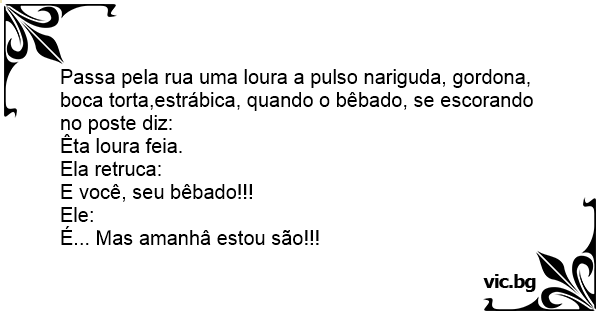 Passa pela rua uma loura a pulso nariguda, gordona, boca torta,estrábica, quando o bêbado, se escorando no poste diz:
