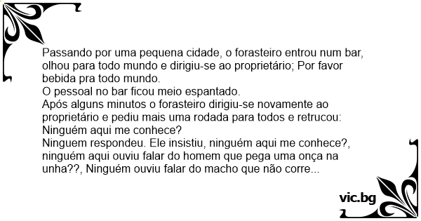 Após alguns minutos o forasteiro dirigiu-se novamente ao proprietário e pediu mais uma rodada para todos e retrucou: Ninguém aqui me conhece?