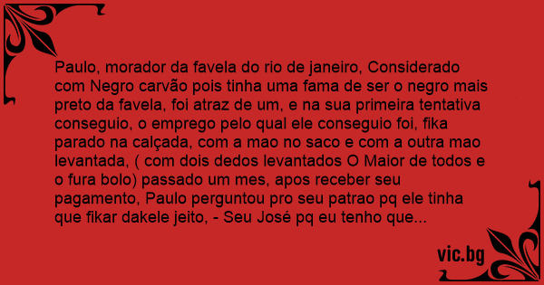 Paulo, morador da favela do rio de janeiro, Considerado com Nеgrо carvão pois tinha uma fama de ser o nеgrо mais preto da favela, foi atraz de um, e na sua primeira tentativa conseguio, o emprego pelo qual ele conseguio foi, fika parado na calçada, com a mao no saco e com a outra mao levantada, ( com dois dedos levantados O Maior de todos e o fura bolo) passado um mes, apos receber seu pagamento, Paulo perguntou pro seu patrao pq ele tinha que fikar dakele jeito, - Seu José pq eu tenho que fikar assim, seu José respondeu,- Simples meu jovem, significa, saco de carvão dois reais. kkkkkkkkkkkkkk'