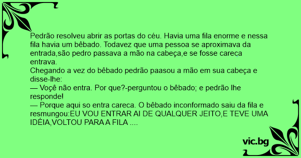 Pedrão resolveu abrir as portas do céu. Havia uma fila enorme e nessa fila havia um bêbado. Todavez que uma pessoa se aproximava da entrada,são pedro passava a mão na cabeça,e se fosse careca entrava.