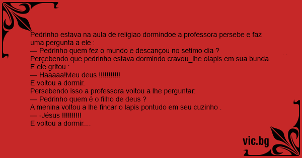 Pedrinho estava na aula de religiao dormindoe a professora persebe e faz uma pergunta a ele :