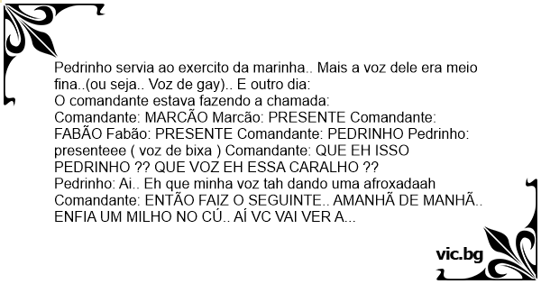 Pedrinho servia ao exercito da marinha.. Mais a voz dele era meio fina..(ou seja.. Voz de gаy).. E outro dia: