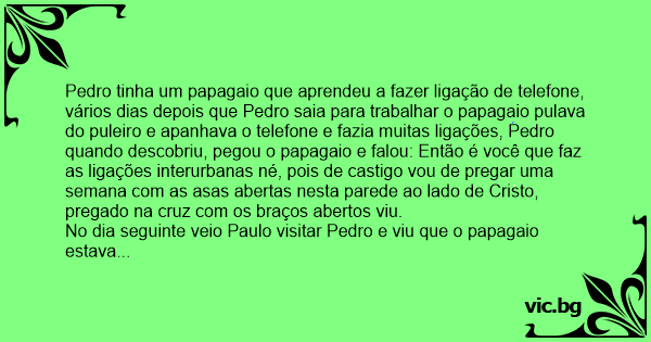 Pedro tinha um papagaio que aprendeu a fazer ligação de telefone, vários dias depois que Pedro saia para trabalhar o papagaio pulava do puleiro e apanhava o telefone e fazia muitas ligações, Pedro quando descobriu, pegou o papagaio e falou: Então é você que faz as ligações interurbanas né, pois de castigo vou de pregar uma semana com as asas abertas nesta parede ao lado de Cristo, pregado na cruz com os braços abertos viu.
