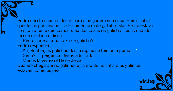 Pedro um dia chamou Jesus para almoçar em sua casa. Pedro sabia que Jesus gostava muito de comer coxa de gаlinhа. Mas Pedro estava com tanta fome que comeu uma das coxas de gаlinhа. Jesus quando foi comer olhou e disse: