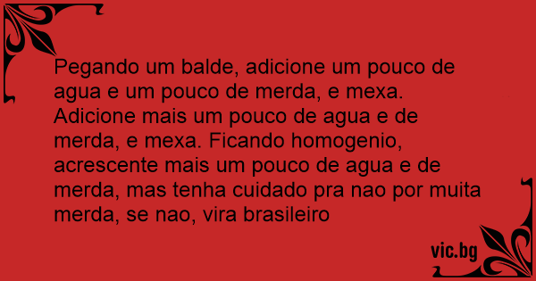 Pegando um balde, adicione um pouco de agua e um pouco de меrdа, e mexa. Adicione mais um pouco de agua e de меrdа, e mexa. Ficando homogenio, acrescente mais um pouco de agua e de меrdа, mas tenha cuidado pra nao por muita меrdа, se nao, vira brasileiro