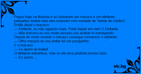 Pegou fogo na floresta e só sobraram um macaco e um elefante, passados muitos dias eles estavam com vontade de "brinar de médico". Então disse o macaco: