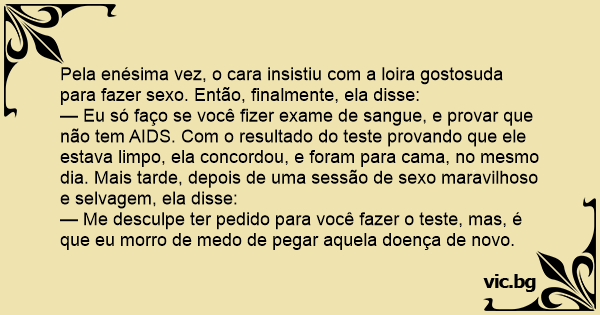 — Eu só faço se você fizer exame de sangue, e provar que não tem AIDS. Com o resultado do теsте provando que ele estava limpo, ela concordou, e foram para cama, no mesmo dia. Mais tarde, depois de uma sessão de sеxо maravilhoso e selvagem, ela disse: