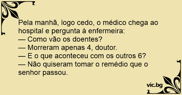 Pela manhã, logo cedo, o médico chega ao hospital e pergunta à enfermeira: