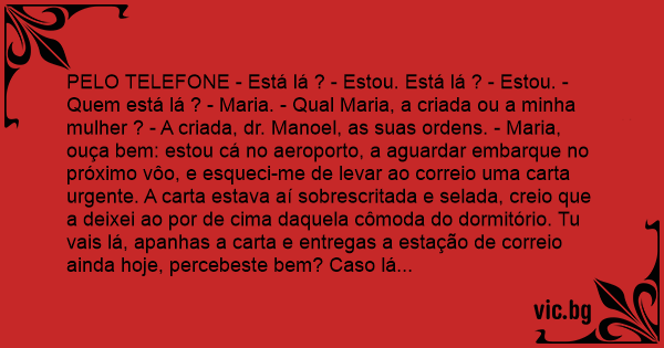 PELO TELEFONE - Está lá ? - Estou. Está lá ? - Estou. - Quem está lá ? - Maria. - Qual Maria, a criada ou a minha mulher ? - A criada, dr. Manoel, as suas ordens. - Maria, ouça bem: estou cá no aeroporto, a aguardar embarque no próximo vôo, e esqueci-me de levar ao correio uma carta urgente. A carta estava aí sobrescritada e selada, creio que a deixei ao por de cima daquela cômoda do dormitório. Tu vais lá, apanhas a carta e entregas a estação de correio ainda hoje, percebeste bem? Caso lá não esteja, tu voltas cá ao aparelho auscultador e me avisas. Fico a esperar cá na linha. Vai. - Pois não, dr. Manoel. (tempo) Dr. Manoel, eu estava quase a entrar ao aposento, mas vi que dona Maria esta lá, despida. - Ora, Maria, basta que batas a porta, que peças licença. A patroa sabe que se trata de coisa urgente. Anda, volta lá e faz o que te mandei. - Pois não, dr. Manoel. (tempo) Dr. Manoel, perdão, mas eu cá lá já não entro, não. - Como ? Por que não ? - Agora não, dr. Manoel. Acabo de ver que dona Maria está acompanhada.