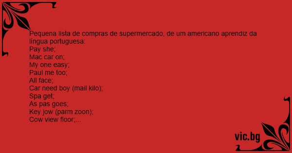 Pequena lista de compras de supermercado, de um americano aprendiz da língua portuguesa: