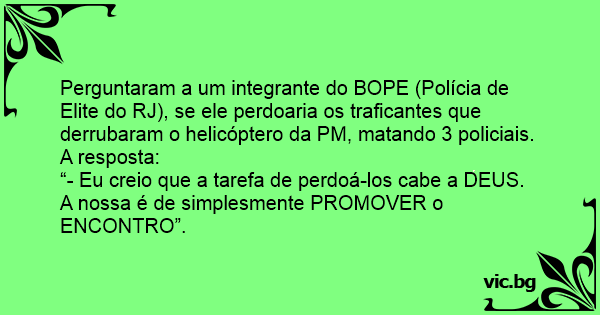Perguntaram a um integrante do BOPE (Polícia de Elite do RJ), se ele perdoaria os traficantes que derrubaram o helicóptero da PM, matando 3 policiais.