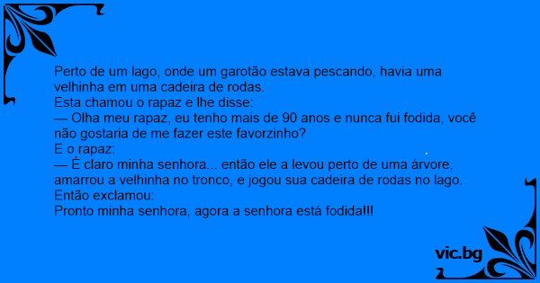 Perto de um lago, onde um garotão estava pescando, havia uma velhinha em uma cadeira de rodas.