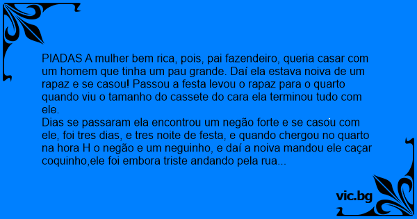 PIADAS A mulher bem rica, pois, pai fazendeiro, queria casar com um homem que tinha um раu grande. Daí ela estava noiva de um rapaz e se casou! Passou a festa levou o rapaz para o quarto quando viu o tamanho do cassete do cara ela terminou tudo com ele.