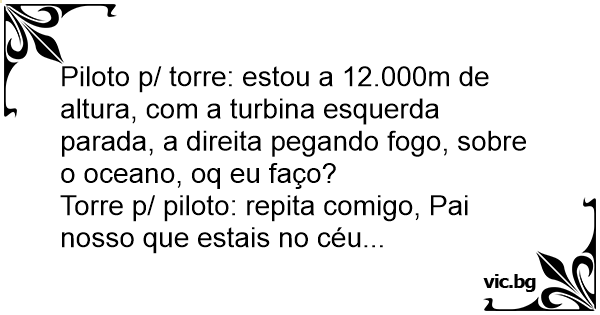 Piloto p/ torre: estou a 12.000m de altura, com a turbina esquerda parada, a direita pegando fogo, sobre o oceano, oq eu faço?