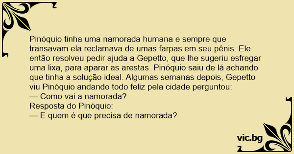 Senelis išdrožė iš medžio Pinokį ir išleido į pasaulį. Grįžta Pinokis po savaitės nuliūdęs ir senelis klausia: - Tai kas atsitiko? - Žinai, susiradau merginą ir neturiu to daikčiuko... - Nieko, ne...