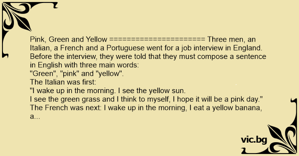 Pink, Green and Yellow ====================== Three men, an Italian, a French and a Portuguese went for a job interview in England.