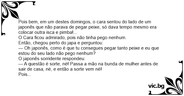Pois bem, em um destes domingos, o cara sentou do lado de um japonês que não parava de pegar peixe, só dava tempo mesmo era colocar outra isca e pimba!...