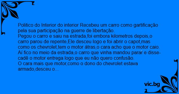 Pegou o carro e saiu na estrada,foi embora kilometros depois,o carro parou de repente,Ele desceu logo e foi abrir o capot,mas como os chevrolet,tem o motor átras,o cara acho que o motor caio. Aí fico no meio da estrada,o carro que vinha mandou parar e disse-cadê o motor entrega logo que eu não quero confusão.