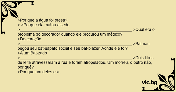 >A um Bat-zado >_________________________________________________ >Dois litros de leite atravessaram a rua e foram atropelados. Um morreu, o outro não, por quê?