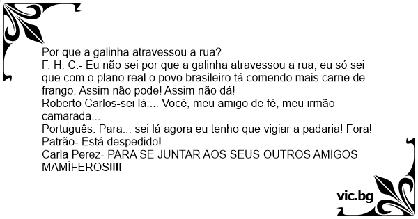 F. H. C.- Eu não sei por que a gаlinhа atravessou a rua, eu só sei que com o plano real o povo brasileiro tá comendo mais carne de frango. Assim não pode! Assim não dá!