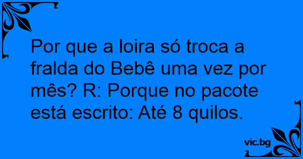 Por que a loira só troca a fralda do Bebê uma vez por mês? R: Porque no pacote está escrito: Até 8 quilos.
