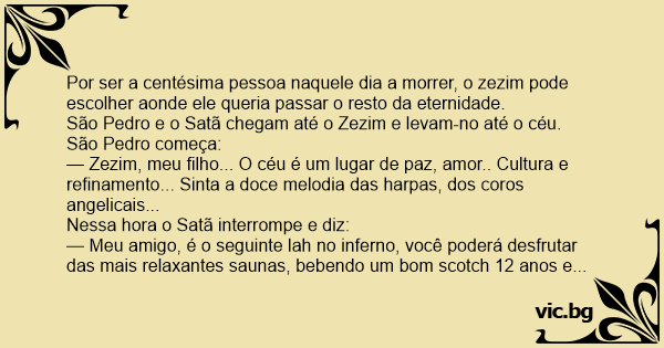 Por ser a centésima pessoa naquele dia a morrer, o zezim pode escolher aonde ele queria passar o resto da eternidade.