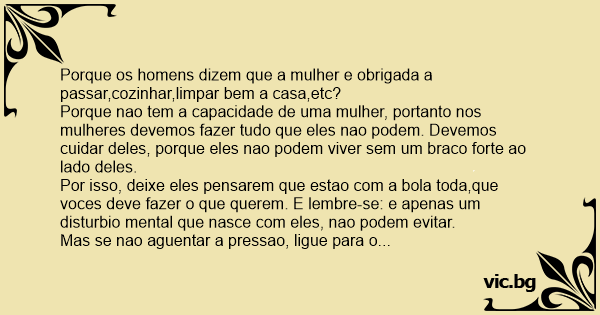 Porque os homens dizem que a mulher e obrigada a passar,cozinhar,limpar bem a casa,etc?