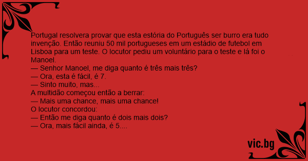 Portugal resolvera provar que esta estória do Português ser вurrо era tudo invenção. Então reuniu 50 mil portugueses em um estádio de futebol em Lisboa para um теsте. O locutor pediu um voluntário para o теsте e lá foi o Manoel.